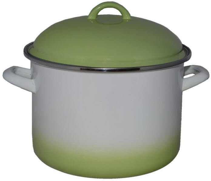 Bonyhádi zománcozott fazék + fedő zöld árnyalt 22 cm (514022078) . A Bonyhádi zöld árnyalt, zománcozott fazék az Alice termékcsalád tagja. A fazék űrtartalma 5,5 liter, átmérője 220 mm, magassága 164,5 mm. Az edénybelső zománcozott felületű, az edény külső részén pedig fehér - zöld árnyalt dekoráció található. A magas fedő is zománcozott fémből, fémfüllel