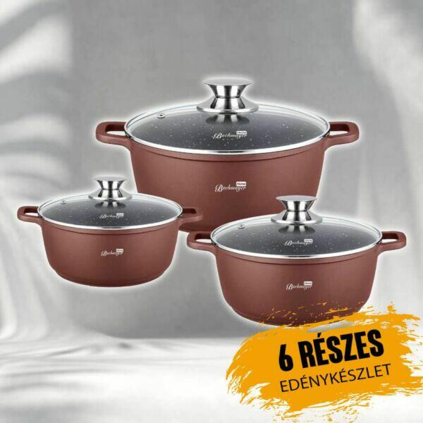 Bachmayer 6 részes márvány bevonatos edénykészlet BM7863 Leírás: Az edénykészlet korszerű, nem rozsdásodó márvány bevonattal készült. Hosszútávú, stabil minőség megtartására tervezték, maximális teljesítmény s kényelem biztosítása mellett. Hőtároló, 3 rétegű hővezető alj. Az étel gyorsan felmelegszik, de az edények az ételt hosszan melegen tartják. Mindenfa