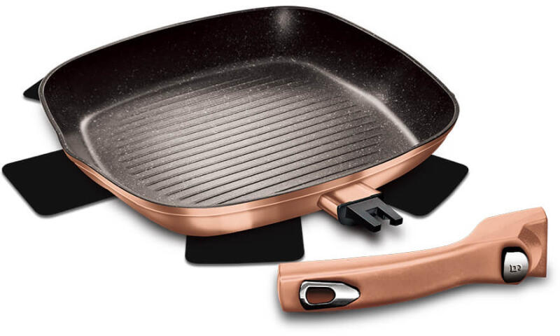 A Grill serpenyő levehető nyéllel (28 cm) a Metallic Line Rose Gold Edition termékcsalád egyik stílusos tagja, amelyet mindenkinek ajánlunk, aki szereti a minőséget és az eleganciát a konyhában. A kovácsolt alumíniumból készült serpenyő Ø28*4,1 cm méretű és 2,1 literes űrtartalommal rendelkezik, így alkalmas kisebb és nagyobb mennyiségű ételek sütésére is. Főbb tula