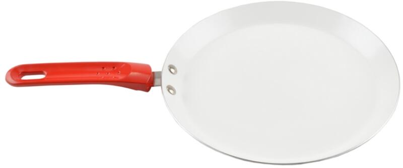 Palacsintasütő tulajdonságai: Anyaga: nemtapadó kerámia bevonattal ellátott alumínium, műanyag Mérete: 26 cm átmérőjű felül, 25,4 cm átmérőjű alul, 2,3 cm magas, 18,3 cm hosszú a nyele, 45,7 cm hosszú nyéllel együtt Súlya: 138 g Színe: piros Használható: gáz-, kerámialapos -, elektromos-tűzhelyen egyaránt. Tisztítása: Semleges folyékony mosogatószerrel mossa el! K