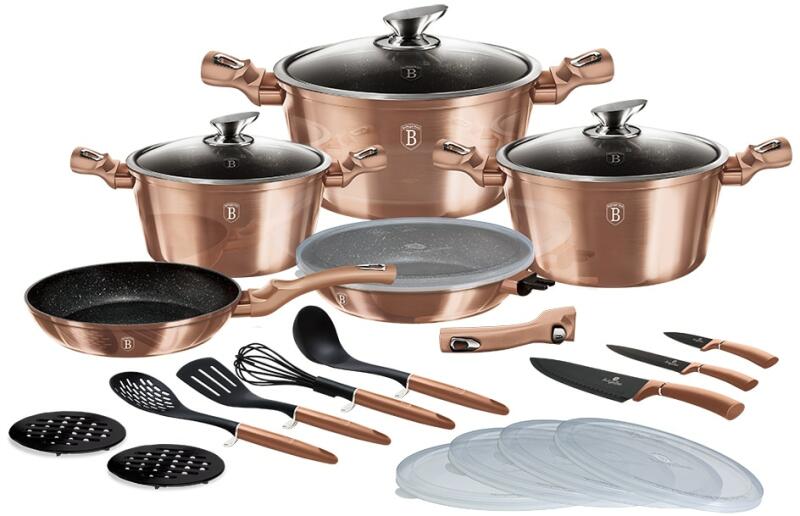 Gyártó: Berlinger Haus Modell: Metallic Line Rose Gold Edition 22 pcs (BH/7182) Leírás: A 22 részes edénykészlet levehető nyéllel ideális választás a modern konyhák számára, amely eleganciát és praktikumot ötvöz. A Metallic Line Rose Gold Edition család tagjaként kiemelkedik az egyedi megjelenésével és a kiváló minőségével. A kovácsolt alumíniumból készült edénye