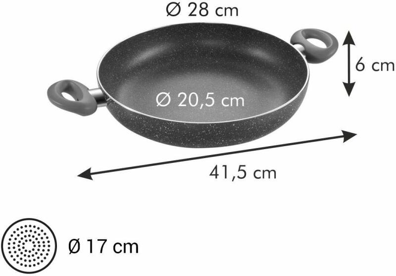 Tescoma MANICO ROSSO Serpenyő ø 28 cm, kétfülű Első osztályú, csiszolt, természetes kő jellegű tapadásmentes bevonat, csúszásmentes fogantyúk a biztonságos és kényelmes használat érdekében, rozsdamentes acélból készült indukciós belső. Minden ismert típusú tűzhelyen – villany-, gáz-, üvegkerámia és indukciós tűzhelyeken is alkalmazható, mosogatógépben is mo