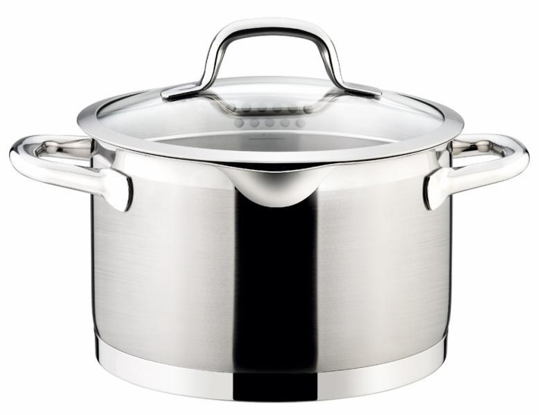 Anyaga: rozsdamentes acél 18/10, üveg fedő Üveg rozsdamentes acél szürőfedő kis- és nagy nyílásokkal a kényelmes szűrés érdekében Extra erős szendvics alj- a tűzhelyről áradó hő egyenletesen jut az edény belsejébe és egyenletesen oszlik el az egész alj felületén A szendvics alj kiváló hőgyűjtő tulajdonságokkal rendelkezik ezért az edény energiatakarékos, a tűz