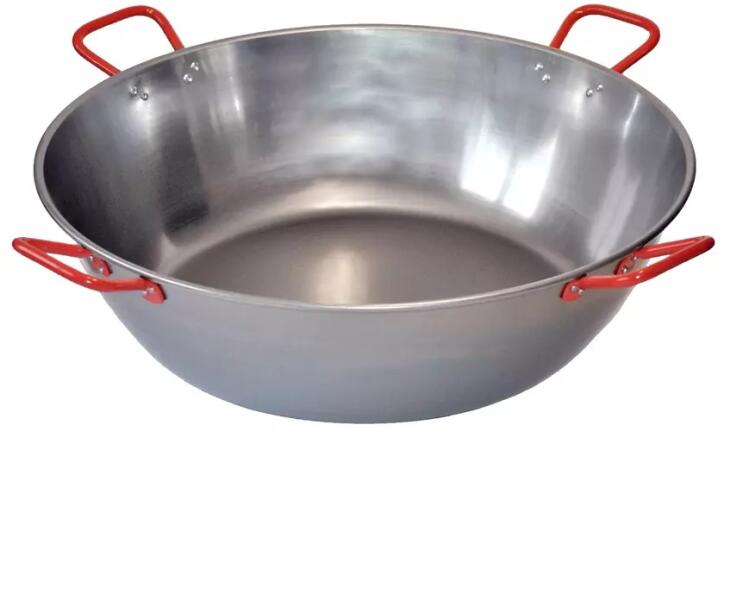 A csomag tartalma:- 1 db Paella füles serpenyő polírozott 4 fülű 65 cm Anyaga: polírozott acél Mérete: 67 cm külső átmérő fent, 82,5 cm átmérő füllel, 48 cm alsó átmérő , 19 cm magas, 22 cm magas a fülénél Súlya: 7,36 kg Használható : gá z-, elektromos tűzhelyen Tisztítása : Seml eges folyékony mosogatószerrel mossa el! Kerülje a karcosodást okozó szerek és esz