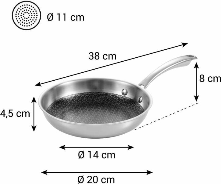 Tescoma SteelCRAFT Serpenyő ø 20 cm Luxus serpenyő első osztályú rozsdamentes szendvics acélból, forradalmi tapadásmentes bevonattal, acélrácsokkal ellátva az intenzív, egyenletes pirításhoz odaégés nélkül. Ellenáll a fém konyhai eszközöknek, minden típusú tűzhelyre alkalmas, beleértve az indukciósat is, valamint sütőben történő pirításra egyaránt használható.