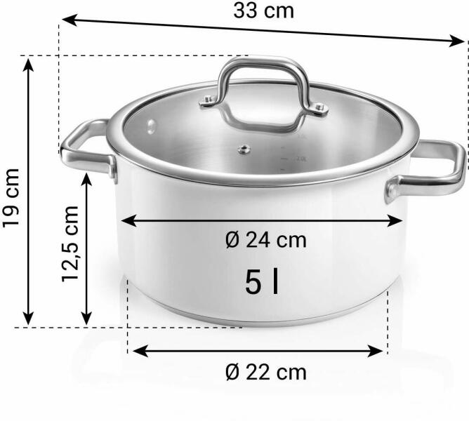 Luxuskivitelezésű konyhai edény professzionális és otthoni főzésre, első osztályú rozsdamentes acélból készült. Üveg, rozsdamentes acél fedő, masszív szendvics alj és rozsdamentes acél fülek a komfortos főzéshez. Az összes típusú tűzhelyen használható - gáz, villany, üvegkerámia és indukciós, mosogatógépben is mosható.