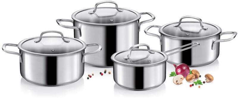 A Tescoma Optima főzőedénykészlet tartalmaz egy fazekat fedővel (20 cm, 4 l), egy lábast fedővel (20 cm, 3 l), egy lábast fedővel (18 cm, 2 l), egy lábast fedővel (16 cm, 1,5 l). A vízzáró acél fogantyúkba még intenzív mosogatógépben történő mosogatás esetén sem jut be víz. Az üvegfedelek gőznyílással rendelkeznek, a szendvics indukciós alap pedig minden típusú tű