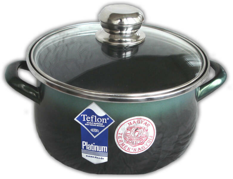 Bonyhádi Platinum Fazék +üvegfedő 20cm (514020032). A Bonyhádi Platinum üvegfedős fazék űrtartalma 3.25 liter, átmérője 200 mm. A színe árnyalt zöld metál. Az edénybelső három rétegű, dörzsálló Teflon® Platinum bevonattal készült. A Bonyhádi zománcozott edények a termékre vonatkozó, teljes körű információkat tartalmazó, zománcba beégetett fenékdekoráció