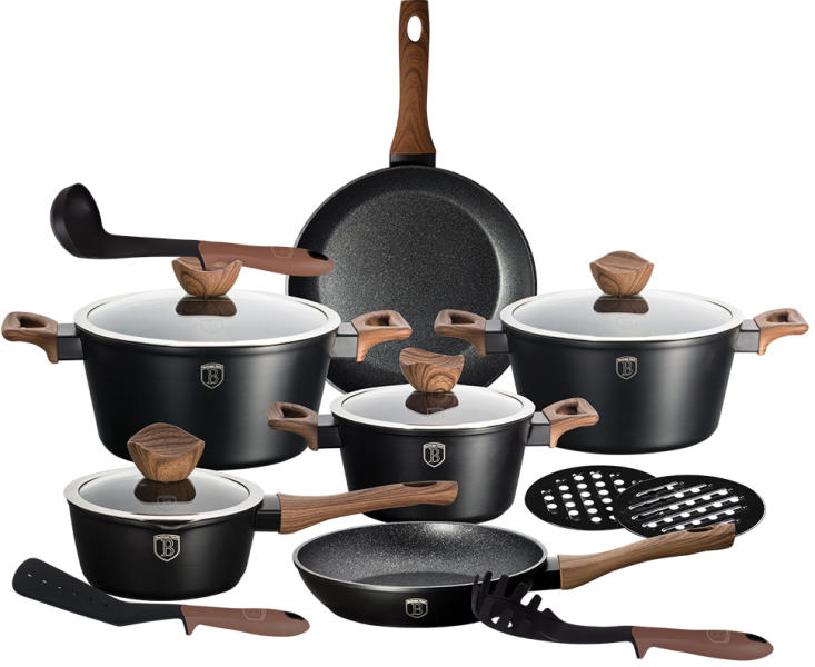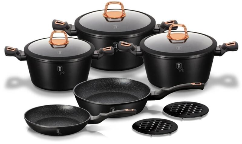 Berlinger Haus 10 részes edénykészlet Black Rose - BH-1645N A BerlingerHaus tapadásmentes edényei 3 rétegű és tartós márvány bevonatukkal megakadályozzák, hogy sütés-főzés közben az étel hozzáragadjon az edények falához. Minimális zsiradékkal használhatók, így segítenek az egészséges táplálkozásban. Bevonatuk nem tartalmaz káros anyagokat, PFOA, ólom és kadmium