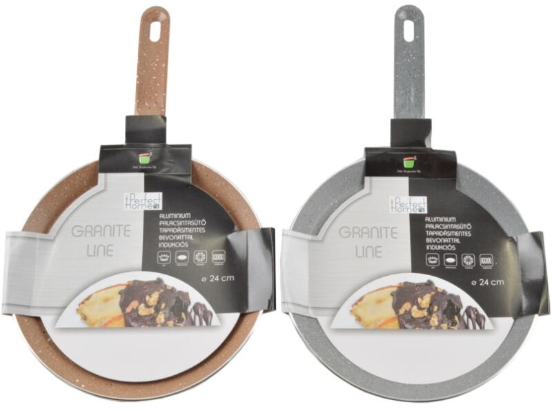 A csomag tartalma:- 1 db Granite Line palacsintasütő tapadásmentes bevonattal 24 cm Anyaga: tapadásmentes bevonattal ellátott alumínium, műanyag Mérete: 24,4 cm átmérőjű felül, 23,6 cm átmérőjű alul, 2 cm magas, nyele 15,4 cm hosszú, hossza nyéllel együtt 40,3 cm Súlya: 190 g Has ználható: Minden tűzhelyen (gáz-, kerámialapos-, elektromos-, indukciós főzőfelületen egy