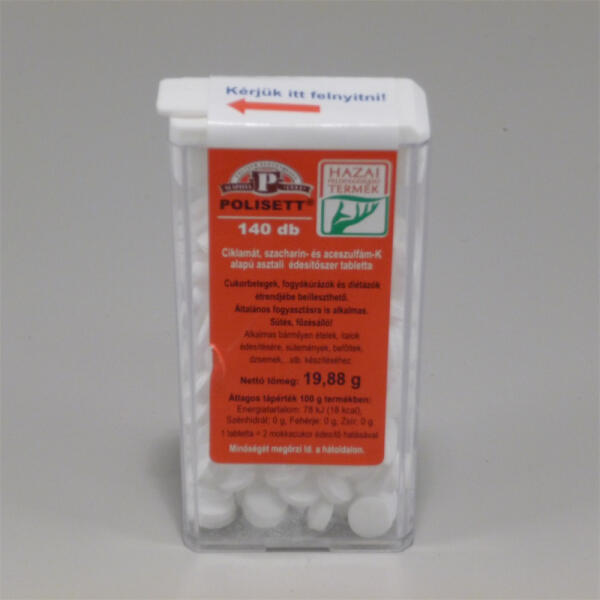 Politur polisett édesítő tabletta 140 db POLITUR POLISETT ÉDESITÖSZER. Sütés- főzés álló édesítő tabletta. "Tic-tac dobozos" fiolában az adagolás érdekében. Nem csomósodik, nincs mellékíze, könnyen feloldódik. Fogyókúrázok, cukorbetegek, diétázók részére, és általános fogyasztásra is ajánlott.