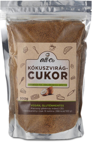 All-co kókuszvirágcukor 500 g Vegán, gluténmentes, alacsony glikémiás indexű (35) természetes édesítőszer. A szervezetben lassan szívódik fel és nem emeli meg nagyon a vércukorszintet. A kókuszpálma virág nektárjából készült tradicionális ázsiai édesítőszer, mely ma az egyik leginkább ajánlott cukorfajta. Számtalan jótékony egészségügyi hatása miatt „csodacuk