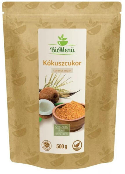 Biomenü bio kókuszvirág cukor 500g Csak könnyen, édesen! Alacsony glikémiás index, diétás, ásványi anyag - és vitaminkomplex. A kókuszcukor egy természetes édesítőszer, amelyet a kókuszpálma virágából kinyert nektár elpárologtatásával állítanak elő. A kókuszcukor karamell szerű ízben gazdag, kinézete hasonlít a barnacukorhoz. A kókuszcukor a fehér és barna cuko