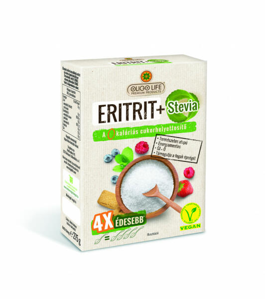NYÍRFACUKOR OLIGO LIFE ERITRIT+STEVIA 4XÉDESEBB 275GEritrit (E968) &Szteviol -glikozidok (E-960) A hagyományos cukorhoz képest négyszeres édesítő értékű Eritrit + Stevia könnyű, jó ízű, és gazdaságos megoldás az otthoni sütés-főzéshez, és bármilyen ital édesítéséhez. Karamell készítésére és élesztő felfuttatására nem alkalmas. Bár kalóriát egyáltalán