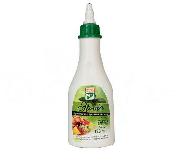 Stevia tartalmú folyékony asztali édesítőszerCukor helyett, 125ml Összetevők: ivóvíz, édesítőszer [Sztíviából származó szteviol-glikozidok (4%)], étkezési sav (citromsav), tartósítószer (kálium-szorbát). 8-10 csepp = 1 kockacukor édesítő hatásával. Alkalmas bármilyen élelmiszer édesítésére (ételek, italok, sütemények, befőttek, dzsemek, stb. ) A termék édes