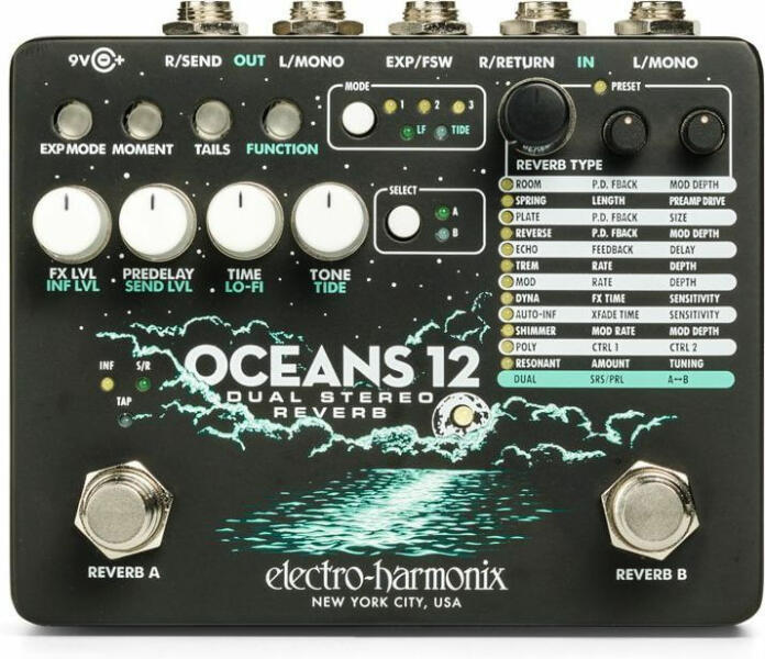 Dupla zengető effektpedál, 12-féle zengető, 24 beállítás Effektek: 12-féle zengető (Room, Spring, Plate, Reverse, Echo, Trem, Mod, Dyna, Auto-Inf, Shimmer, Poly, Resonant) Vezérlők: fx szint (az effektezett és effekt nélküli jel arány), Predelay (0-1 másodperc delay késleltetés - Echo, Shimmer és Resonant effekteknél nem működik), Time (lecsengés ideje), hangszín, Infinity