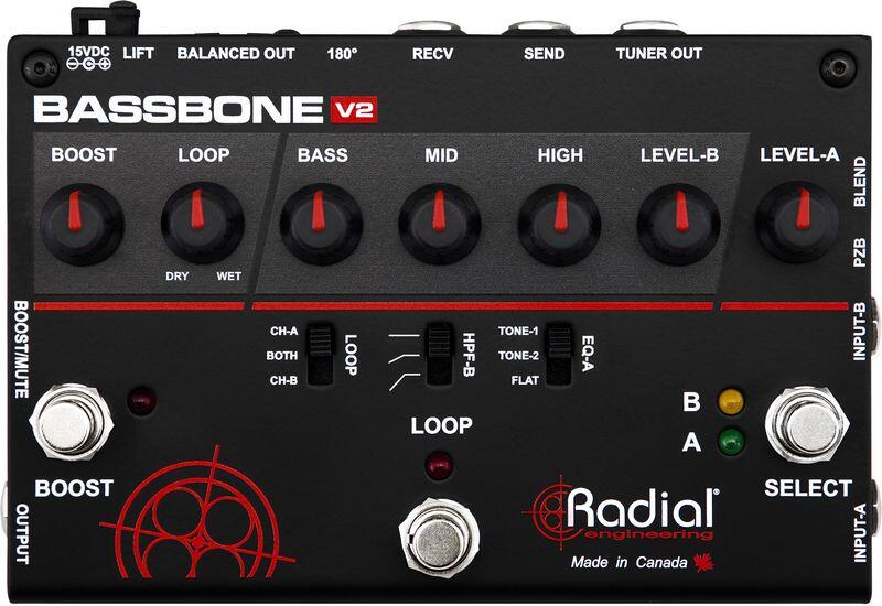 Két csatornás basszusgitár előfok, boooster effekt Közös effekt hurok lábkapcsolóval Tiszta boost áramkör és EQ szabályozók PZB booster és piezo bemenet Beépített Radial DI-Box szimmetrikus kimenettel a PA számára (XLR) Hangoló kimenet Masszív fémház Méretek: 203 x107 x 48mm Súly: 1,2 kg Made in CANADA