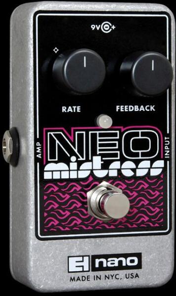ELECTRO HARMONIX EH NEOMISTRESSFLANGER Flanger Effekt Pedál A klasszikus Mistress flanger Nano változata. Tartalmazza a "Filter Matrix" funkciót (kikapcsolja az automatikus filter görbe beállítást) Állitható Rate (sűrűség) és Feedback (mennyi modulált hang keveredjen az eredeti hangal) True Bypass kapcsoló. 9 v elemmel vagy opcionális adapterrel működik.