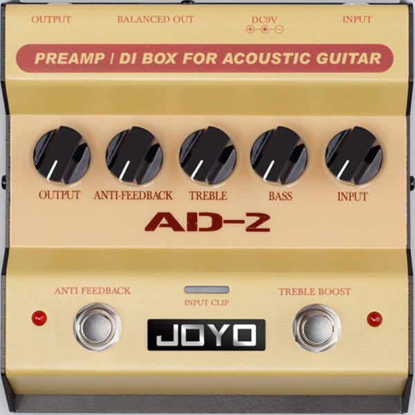 Az AD-2 egy előerősítő és D. I. box akusztikus gitárokhoz. Beépített két sávos EQ-val rendelkezik, amellyel finomhangolhatod az alacsony és magas frekvenciákat. Ezenkívül tartalmaz egy magas hangok erősítését szolgáló funkciót, amely segít kiemelni a hangzást, amikor szükséged van rá. Egy másik nagyon hasznos funkció a visszacsatolásgátló áramkör, ami különösen