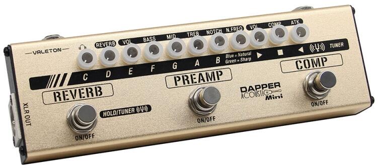 A Dapper Acoustic Mini egy sokoldalú effekt strip: mindent tartalmaz, amire egy gitárosnak szüksége lehet. Effektmodulok : Comp : klasszikus kompresszor hatás Preamp : 3-sávos EQ, gerjedésgátlóval Reverb : természetes, tiszta elhalással XLR kimenet: a jelet közvetlenül a keverőbe/felvételre továbbítja Phones kimenet: a csendes gyakorlásokhoz Spe cifikációk: Táp: 9V DC center n