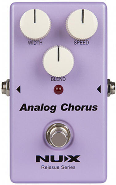 Effekt típus: Chorus Nominális bemeneti szint: 10 dBu Bemeneti impedencia: 1 M ohm Tápegység: 9V elem / AC adapter Jelfeldolgozó: True-bypass Hardware Switching Forgatógombok: Width, Speed, Blend Specifikáció: Vintage Analog Chorus Effect Specifikáció II: Pure Analog Bucket-Brigade Circuit Hossz: 121 mm Szélesség: 77 mm Magasság: 48 mm Súly: 230 g The NUX ANALOG CHORUS pedal from the