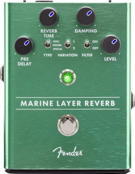 Fender Marine Layer Reverb, effekt pedál Zengetõ pedál klasszikus Hall, Room és modern Shimmer zengetéssel, némításkor folytatódó effekttel. Hall, Room és Shimmer zengetés A zengetés nem ér véget az effekt némításakor LED háttérvilágítású gombok Fender Amp Jewel LED Mágnesesen záródó 9 V-os elemtartó Könnyű és tartós eloxált alumínium konstrukció Tápellátás 9