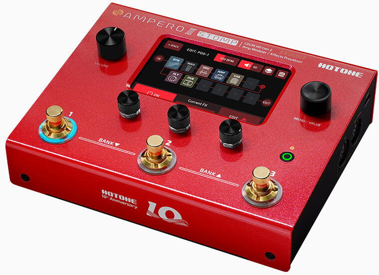 Gyönyörű vörös gyöngyház színű házzal és fényes aranybevonatú recézett lábkapcsoló gombokkal, az Ampero II Stomp 10th Anniversary Limited Edition egy tisztelgés a Hotone 10 éves fennállása előtt. Az Ampero II Stomp 10th Anniversary Limited Edition egy 1200 egységet számláló limitált széria, és minden példányhoz jár egy 10" piros bakelitlemez, amelyen 6 dal találhat