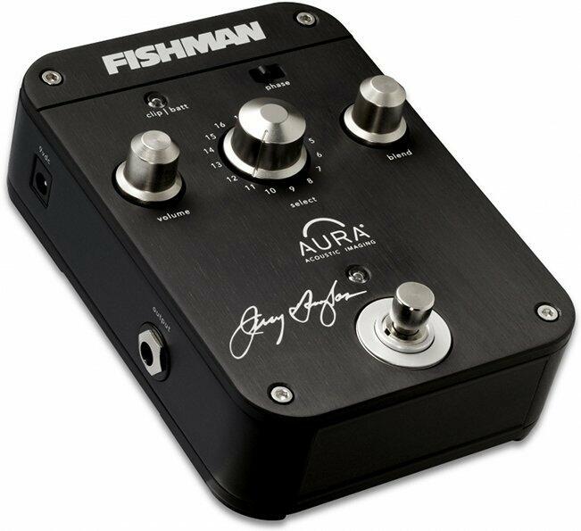 JERRY DOUGLAS AURA IMAGING PEDAL: PRO-AIP-JD1 16 custom Fishman Aura Images created and used by Jerry Douglas specifically for resophonic guitars Volume, Blend, and Image Select controls Feedback-fighting Phase switch Bypass/Mute foot switch Input Trim with Clip/Low Battery indicator 24-bit A/D/A, 32-bit internal processing SPECS PROCESSOR: 32-bit processing MATERIAL: Durable all-metal constructio