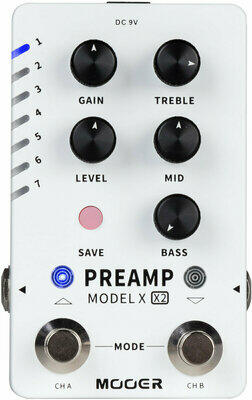 Mooer Preamp Model X2, dual-channel digital preamp effects pedal, based on Mooer's unique MNRS sampling technology, 14 editable user preset slots, each preset can store two different channel settings, supports GNR (amp modules) and GIR (cab modules) files via Mooer Studio to expand the tonal palette, cabinet simulation can be turned on and off, 3 pre-installed cabinet simulations of popular models
