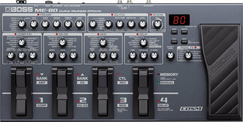 Gitár programozható multieffekt pedál Effektek: kompresszor/FX, Overdrive/Torzító, Modulációs, Delay, Zengető effektek. GT-100-ból származó, update-elt COSM erősítő modellek. A BOSS MDP technológiával készült effektjei közül: Tera Echo, Overtone Vezérlők: 8 pedál kapcsoló, expression pedál, előfok blokk (gain, EQ, hangerő), EQ/FX vezérlők, kompresszor vezérlők, torz