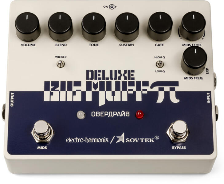 Specifikációk: - Teljesen integrált pedál, ami kombinálja a "Civil War" / "Tall Font" Green Russian Big Muffokat és a Deluxe Big Muff Pi-t. - Lábkapcsolós MIDS EQ, amivel bármilyen hangzás elérhető - High Q / Loq Q kapcsoló - Wicker kapcsoló, ami megnyitja a magas frekvenciatartományt - Noise Gate - Expression pedált bemenet - True Bypass kivitel - 9 V elem tartozék, de használha