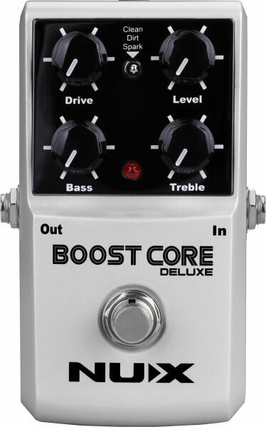 Analóg Booster, Nux Core széria Három üzemmód: Clean, Drive és Spark, pedalboardok nagyszerű kiegészítője, overdrive vagy distortion gazdagításhoz. A Gain növeli a jel szükséges torzítását, 2 sávos EQ. A Boost Core Deluxe önálló hangszínszabályozóként is használható. A Clean üzemmódban a jelerősítés +20 dB a hang negativ befolyásolása nélkül. A Drive és Spark