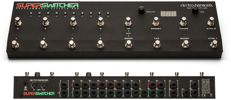 Specifikációk: - Sokoldalú be- és kimenetek - Mono és stereo send/return, insert send/return és mono/stereo kimenet - Hangoló és tap-tempo kimenetek, MIDI be- és kimenetek - 8 db relé-vezérelt true-bypass kör - 128 preset elérhető: 16 bank, egyenként 8 presettel - Nyomógombos lábkapcsoló a BPM beállításához. A Super Switcher konfigurálható, MIDI óra fogadására/küldésé