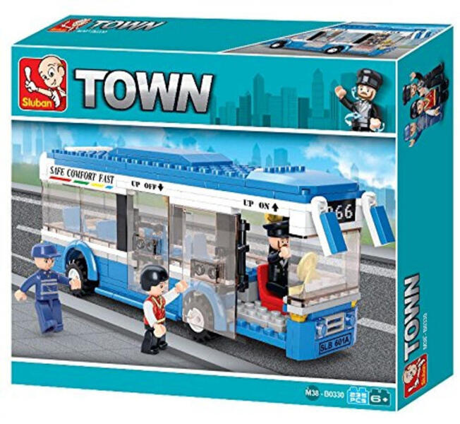 235 darabos Sluban Town kék busz építőjáték készlet három figurával. Az összeépített busz 19 cm hosszú.