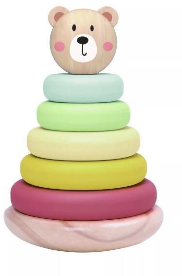 Ez a mackó mintás torony egy 6 darabos, fából készült rakosgatós játék. A bájos fa gyermekjáték 5 gyűrűvel rendelkezik, amelyek egy központi oszlopra illeszkednek. A játék tetején egy macifej található. A különböző gyűrűket tetszőleges sorrendben lehet felrakni a rúdra. A termék minőségi fából készült, így jó választás a környezettudatos, globálisan gondolk