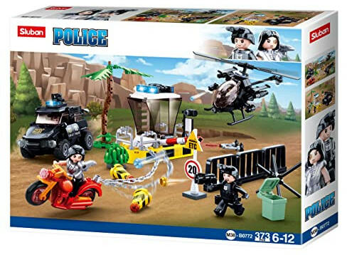 Sluban Police - Rendőrségi határátkelő építőjáték készlet Ebből a Sluban építőjáték készletből egy izgalmas rendőrségi jelenet építhető össze: a határátkelő soropóján egy motoros bandita próbál áttörni de a rendőrrök azonnal üldözőbe veszik. Az üldözésben egy rendőrségi helikopter és egy SWAT terepjáró is részt vesz. A határátkelőhely sorompóból