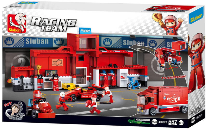Sluban Racing Team – Formula 1 átalakítható csapat kamion 557 darabos Formula 1-eskamion készlet 5 figurával, versenyautóval, kiegészítőkkel és ajándék elválasztóval, valamint kulcstartóval. A Sluban építőjáték készletek szórakoztatva tanítanak. A világszerte ismert építőjáték készletek építőelemei megfelelnek a legszigorúbb biztonsági előírásoknak és kivá