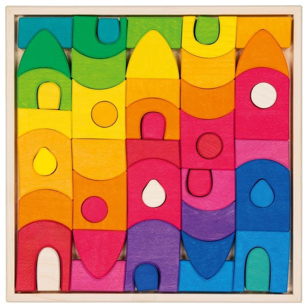 Az építőkockákkal való játék rendkívül jótékonyan hat a kisgyermek értelmi és nyelvi fejlődésére. Ez a színes fa építő kocka szett különböző építő elemeket tartalmaz, hogy a fantázia teremtette térbeli alakzatok felépülhessenek. A z építőkockákkal való kötetlen játék serkenti a gondolkodást, az emlékezetet és a kézügyességet, ráadásul éppen abban a k