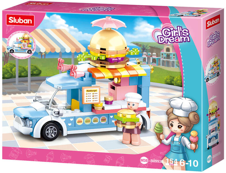 Sluban Girl’s Dream – Hamburgerárus autó építőjáték készlet A 154 darabos Sluban Girl’s Dream építőjáték készletből egy hamburgerárus autó építhető össze. A készlethez tartozik egy hamburgerárus minifigura, a hamburger elemekből összeállítható, valamint az autóban mini sütő is található. A színes kiegészítők, igényesen kidolgozott apró részletek még s