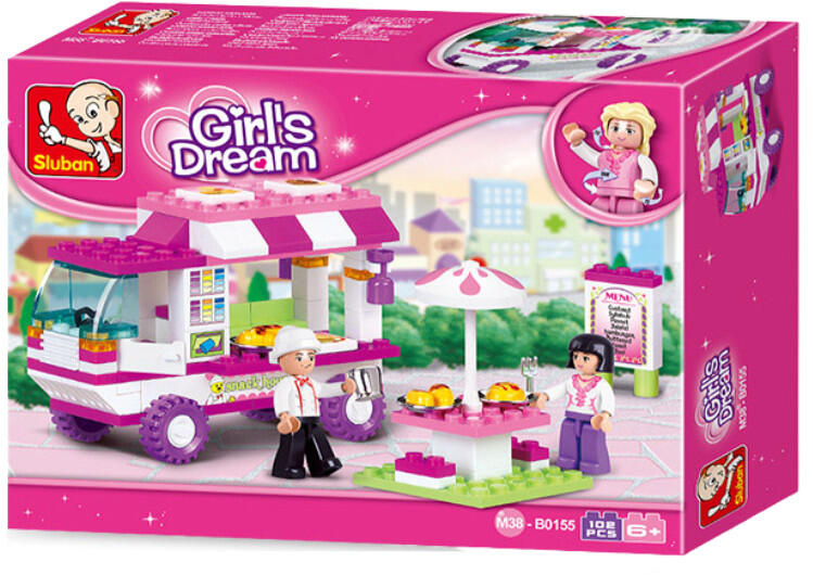 Sluban Girl's Dream - Utcai falatozó építőjáték készlet Ebből a Sluban Girl's Dream építőjáték készletből egy szuper négykerű utcai falatozó építhető össz e. A falatozóhoz tartozó napernyős asztalnál a vendégek helyet foglalhatnak, rendelhetnek a menüből és a kellemes árnyékban falatozhatnak. A készlet összesen 102 építőelemből áll és két figurát tartalmaz