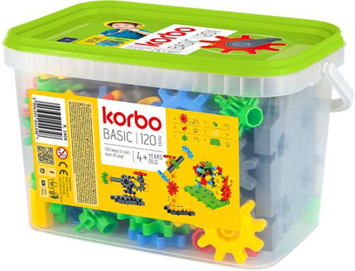 A készlet tartalma: 45 db fogaskerék (kék, piros, szürke, sárga, zöld) 28 db henger (kék, piros, szürke, sárga) 20 db keresztösszekötő (sárga, zöld) 16 db csatlakozó (zöld) 5 db hajtókar (sárga) 6 db alaplap (szürke, zöld) Kreatív építőkészlet, amely a különböző elemek (fogaskerekek, hajtókarok, összekötőelemek) segítségével lehetővé teszi lengő, forgó, mozg