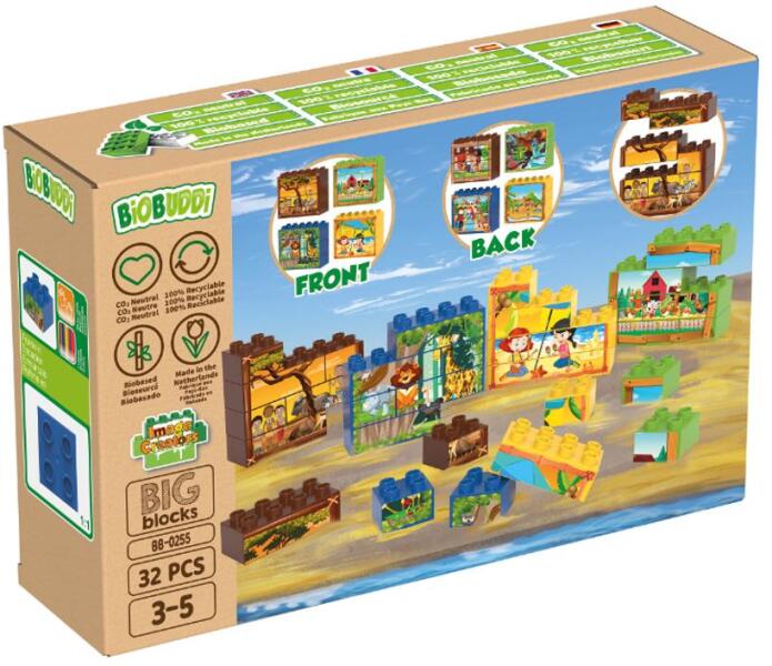 Mi van a dobozban? 32 db nyomattal ellátott építőelem melyből 8 különböző kép rakható ki az előlapra és a hátlapra is. Ezáltal garantált az órákig tartó rejtvényfejtő szórakozás! A készlet 3 és 5 év közötti gyermekek számára készült. Miért környezetbarát a BiOBUDDi? A BiOBUDDi biojátékai cukornádnövények maradványaiból készülnek Hollandiában. A színes