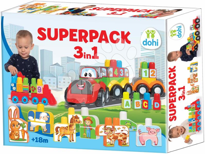 Építőjáték Superpack 3in1 Dohány egy igazán csodás ajándék kisfiúk és kislányok részére már 18 hónapos kortól. Az építőjáték részét képezi traktor 2 utánfutóval, melyekre a kicsik nagy örömmel pakolják majd fel a számokkal, betűkkel és állatkákkal díszített kockákat, és piros vonat 2 vagonnal és 1-től 9-ig megjelölt számos kockákkal. A számoknak kösz