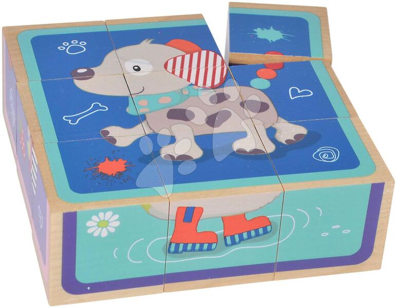 Fa kocka puzzle Picture Cube Friends a német Eichhorn vállalat műhelyéből nagyszerű első kirakós ajándék minden kisfiú és kislány részére már 3 éves kortól. Készségfejlesztő 9-részes kocka készlet 6 különböző állatkás motivumot jelenit meg, igy az összeillesztett kockákon kutyus, macska, nyuszi, kacsa, egérke és mackó ábrái jelennek meg. Kirakózás közben fejl