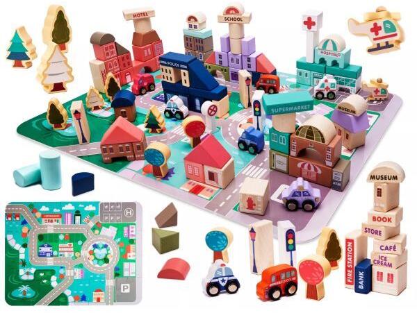 Ezzel a nagyszerű készlettel a gyerekek felépíthetik a saját városukat. Az építőkockák között megtalálhatók a legfontosabb épületek, járművek, növények és még sok más elem is, hogy a jelenetek száma, és így a játék is végtelen lehessen. A játékteret a kicsik kisebb darabokból állíthatják össze, így a kirakózás után indulhat az építkezés. A dobozban talál
