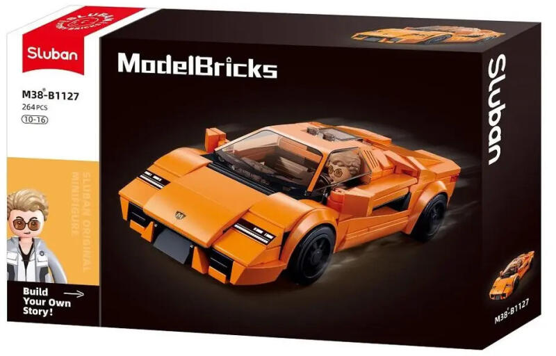Sluban Model Bricks - Narancssárga sportautó Ebből a 277 darabos építőjáték készletből egy részleteiben is igényesen kidolgozott narancssárga sportautó építhető össze. Az építőjáték készlet a sportautó mellett egy figurát is tartalmaz. Az összeépített sportautó 15,4 cm hosszú. A játékot 10 éves kortól ajánljuk. Letölthető összeszerelési útmutató