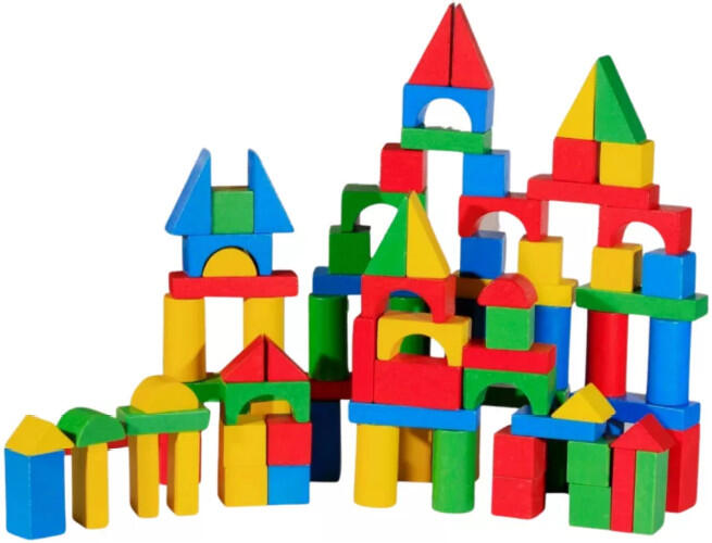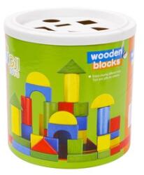 Építs várakat színes fa építőkockákból! Az Építőkocka formaválogató hengerben 45 darabos készlet változatos színű és méretű építőkockát rejt magában, amikből épületeket, járgányokat tudsz összeállítani. A játék különlegessége, hogy a tároló vödör tetején formaválogató rostát találsz, így az elpakolás is fejleszti a kézügyességedet! Az Építőko