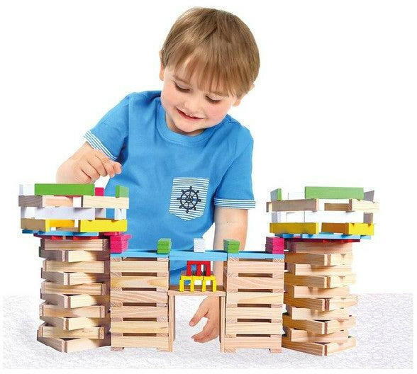 Ezzel a Bino színes város faépítő készletünkkel a gyerekek szabadon engedhetik a fantáziájukat, és bármit megépíthetnek, amit csak el tudnak képzelni. A készlet 150 darab színes fa alkatrészt tartalmaz, amelyek különböző méretekben és formákban kaphatók, így a gyerekek szabadon variálhatják azokat. A faépítő fejleszti a gyerekek finommotorikáját, képzeletét és k