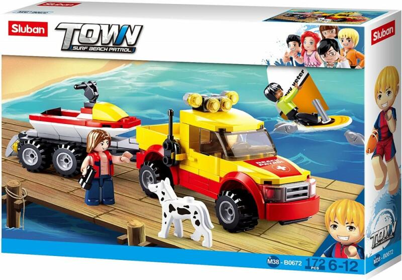 172 darabos Sluban Town Surf Beach Patrol vizimentő terepjárő utánfutóval építőjáték készlet 2 figurával és kiegészítőkkel. A játék 6 éves kortól ajánlott. A Slubant úgy tervezték hogy kompatibilis legyen a legkedveltebb építőkészlet márka termékeivel is. A játékrészek nem toxikusak, megfelelnek a GOST-nak, és minőségi bizonyítvánnyal rendelkeznek. A készletek
