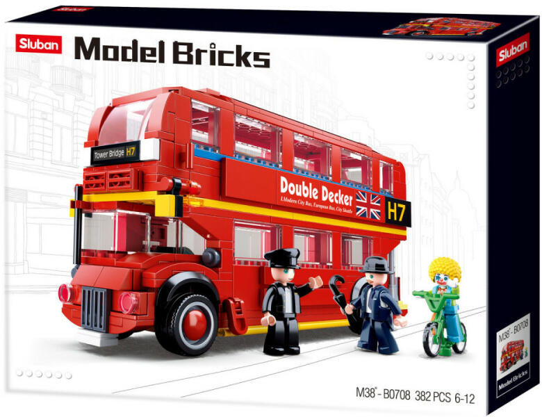 382 darabos Sluban Model Bricks - Londoni emeletes busz építőjáték készlet 3 figurával. Építsd meg te is a klasszikus angliai Double-deckert! A z összeépített busz 21 cm hosszú. A Sluban építőjáték készletek szórakoztatva tanítanak. A világszerte ismert építőjáték készletek építőelemei megfelelnek a legszigorúbb biztonsági előírásoknak és kiváló minőségű a